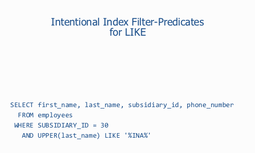 (subsidiary_id, UPPER(last_name))The column SUBSIDIARY_ID is the first index column so it can be used as an access predicate. The expression UPPER(last_name) covers the LIKE filter as index filter predicate. Indexing the uppercase representation saves a few CPU cycles during execution, but a straight index on LAST_NAME would work as well. You’ll find more about this in the next section.